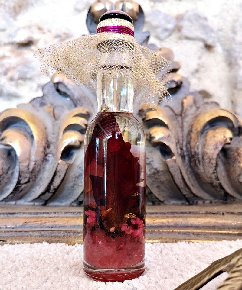 Sur une base d’huile végétale d’abricot et d’amande douce, vous pourrez noter la présence de Musk Blanc, d’huile essentielle de Rose de Dammas de Cannelle et de Patchouli. Nous l’avons bénie avec des morceaux de cristal de quartz rose, de la résine de rose et des racines de Rhodiola Rosea très réputées pour ses effets aphrodisiaques et connu comme un des composants principaux de filtre d’amour de l’époque.