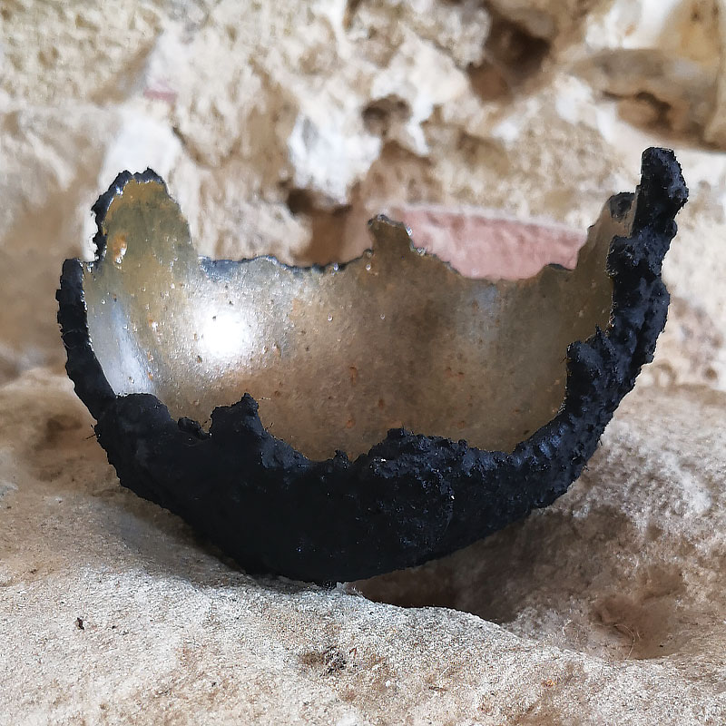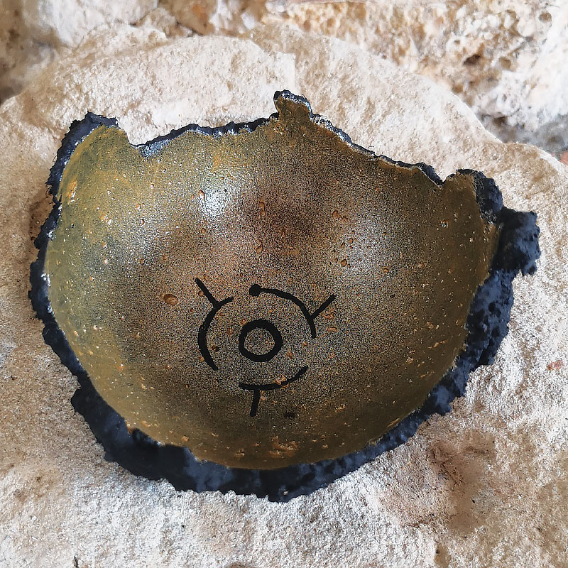 Cette coupe, entièrement fabriquée de manière artisanal a été nommé « Regalia Aegyptia » qui signifie « Egypte » en français. Un nom donné pour sa couleur dorée et son hiéroglyphe / sigil dessiné au centre. Formée sur une base de pierre galactiques, ses cratères et sa forme planétaire en font une création unique. Tel un astéroïde, l’extérieur est d’un vieux noir et l’intérieur d’une couleur or ancien et signé par un sigil mystique au milieu, augmentant la méditation, l’ouverture du troisième œil, la connexion divine.