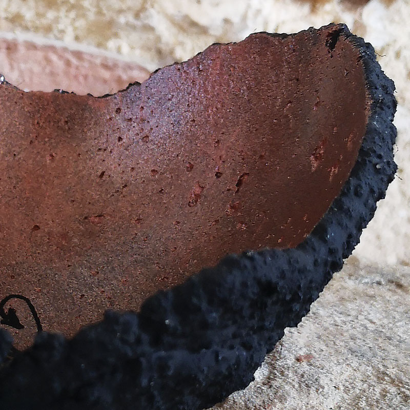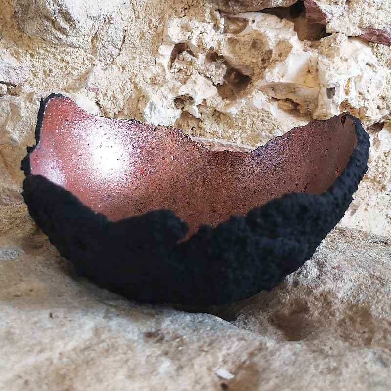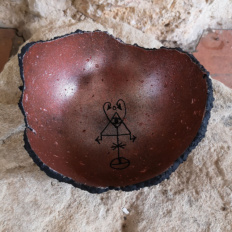 Cette coupe, entièrement fabriquée de façon artisanale a été nommée « Regalia Sabbatum » qui signifie « Sabbat » en français. Nous l’avons nommé ainsi selon le sigil magique inscrit au centre qui provient de la culture Hoodoo et qui permet d’ouvrir les barrières lors de puissantes méditations. Formée sur une base de pierres galactiques, ses cratères et sa forme planétaire en font une création unique. Tel un astéroïde, l’extérieur est d’un vieux noir et l’intérieur d’une couleur vieux rose ancien et signé par un sigil mystique au milieu, agissant sur le psychique, il permet d’atteindre un niveau spirituel plus élevé et ainsi facilite les voyages du corps astral, l’ouverture de portails ainsi que le bien-être et la confiance en soi.