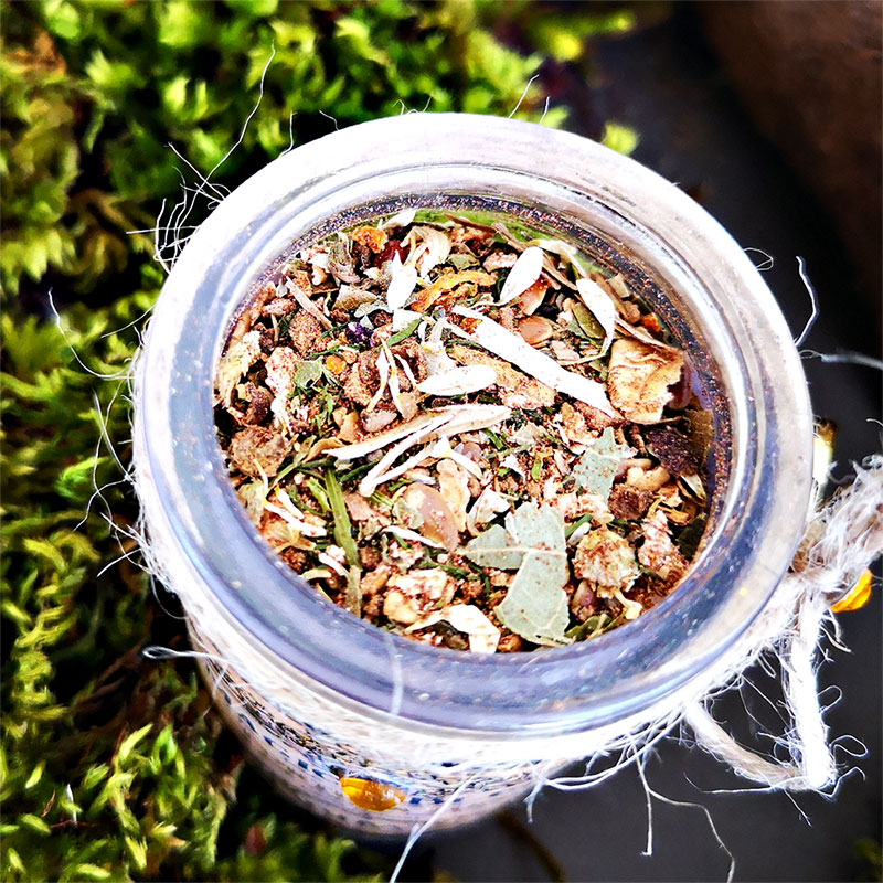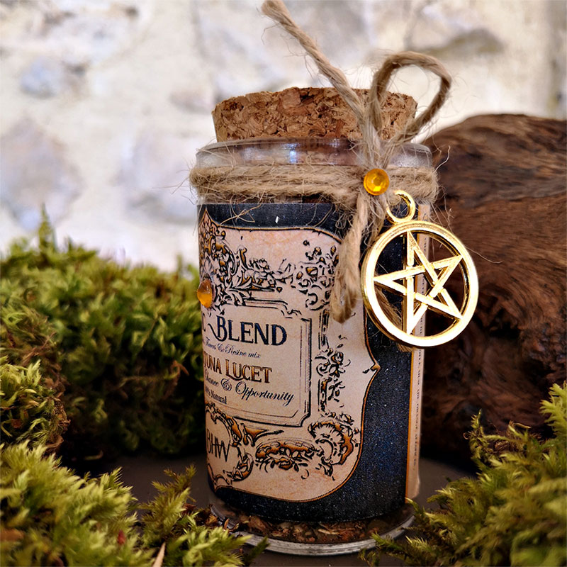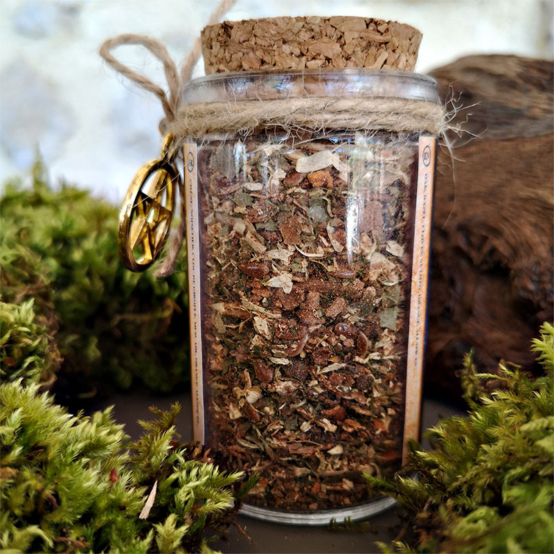 Un fin mélange de feuilles, d’écorces de glands et de mousse de chêne espagnol broyé allié avec les végétaux les plus puissant dans ce domaine dont la cannelle, la noix de muscade, l’écorce de noisetier, l’avoine et bien d’autres ingrédients que nous garderons encore une fois sous notre protection. Le tout aura été mélangé puis béni lors de chaque pleine lune par de la résine d’or et de benjoin.