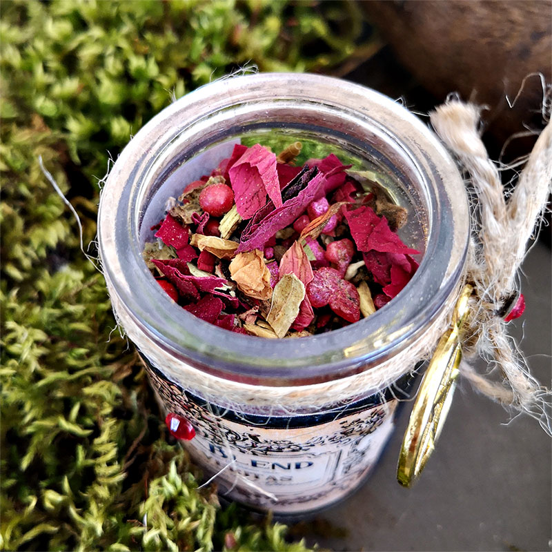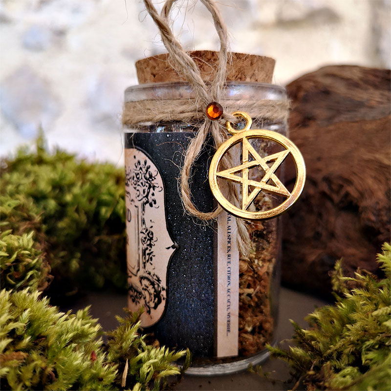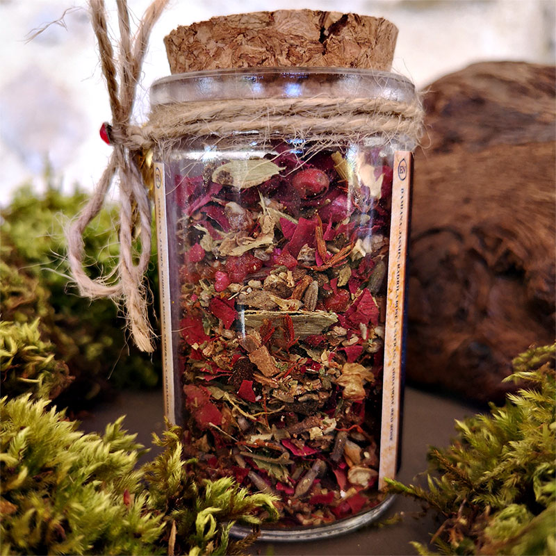 Composé d’armoise, de graines et feuilles de coriandre, d’Allspices, de feuilles de rue et bien d’autre ingrédients que nous garderons secrets, le tout aura été béni le jour de la Saint Jean avec de la résine pure d’acacia ainsi que de la terre bénie provenant de Jérusalem,.