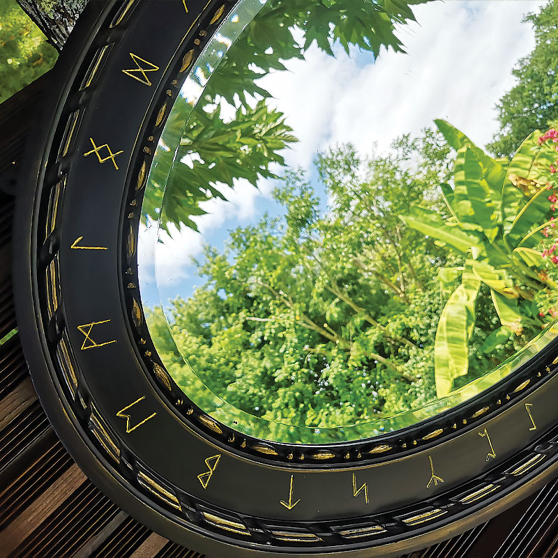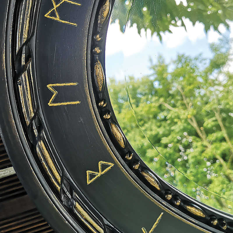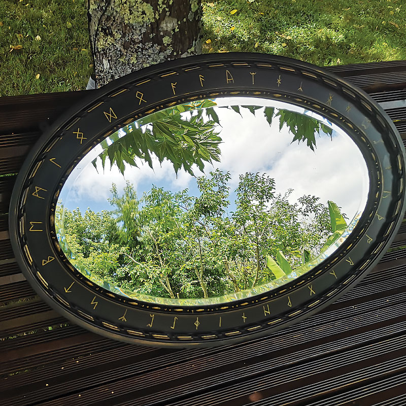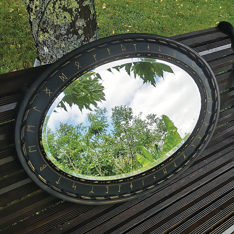 Le miroir fut gravé par notre couvent après avoir été étudié et purifié. Il y a cette énergie très spécifique se cachant dans la pureté de cette glace et les runes sont faites pour contenir cette énergie jusqu’à ce qu’elle trouve son nouvel acquéreur.