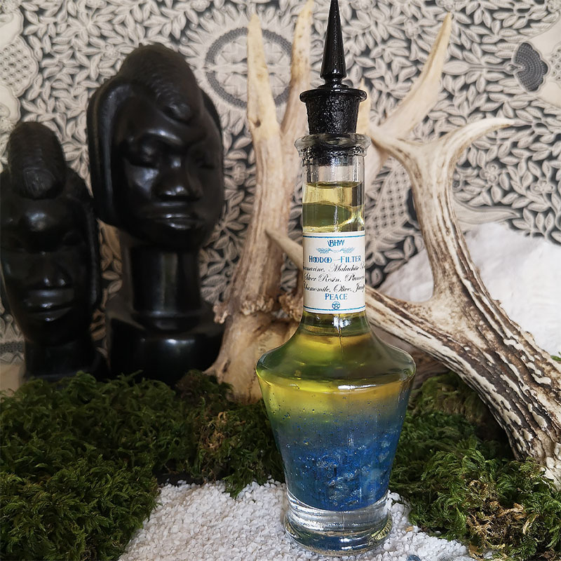 « Nos philtres Hoodoo appelés également, Dressing Oils ou Conjuring Oils sont des huiles fabriquées uniquement à partir d’herbes, de résines, d’huiles et d’ingrédients secrets de la plus haute qualité. Que votre intérêt se porte sur la divination ou la pratique du Hoodoo, du Voodoo, la Conjuration, la Santeria, la Wicca, le Pagan ou simplement votre magie personnelle, nos huiles ont été soigneusement conçues pour incorporer les propriétés magiques nécessaires pour vous aider à réaliser tous vos désirs d’amour, de chance, d’argent, de réussite et de bonheur. »