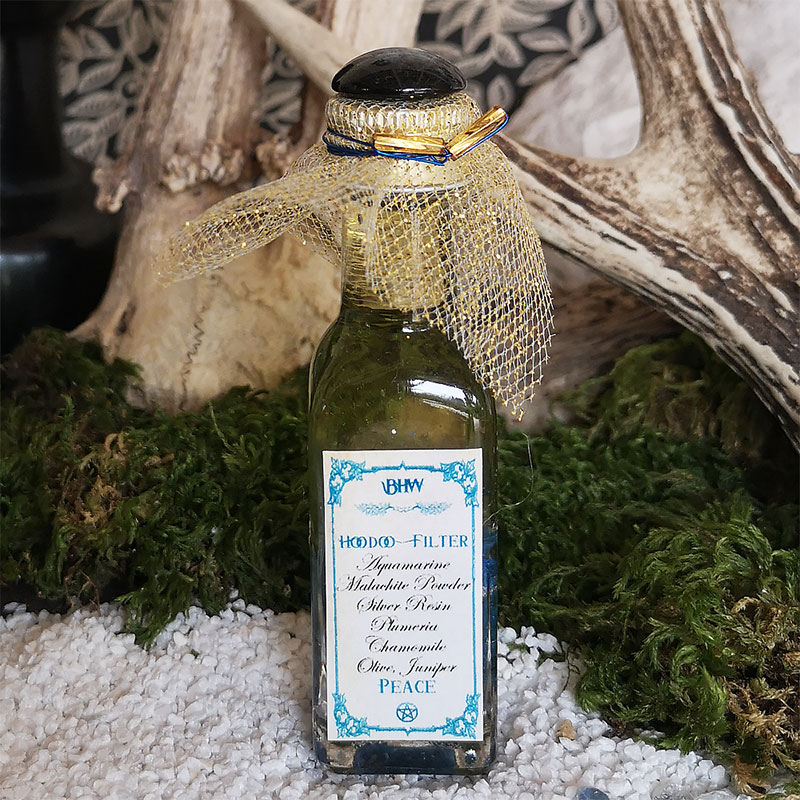Les feuilles d’olivier et les baies de genièvre dans la magie ont longtemps été associées à la paix. Elles peuvent être utilisées dans des offrandes rituelles ou des thés pour soulager l’anxiété, afin que l’on puisse améliorer ses capacités de manifestation. Notre philtre « PEACE » est doux et guérissant pour le corps, l’esprit, formant une promesse de longévité. Cela fonctionne grandement avec l’énergie du cœur, créant une motivation passionnée, tout en calmant et en équilibrant les émotions, aidant ainsi à « aller plus loin ».